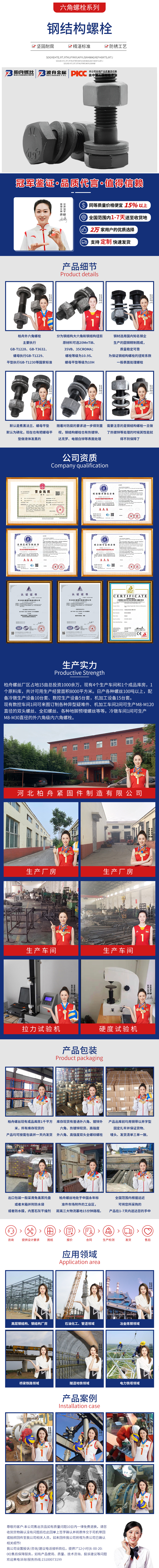 產(chǎn)品介紹:柏舟外六角螺栓主要執(zhí)行GB-T1228、GB-T3632、螺母執(zhí)行GB-T1229、平墊執(zhí)行GB-T1230等國家標(biāo)準(zhǔn)。分為鋼結(jié)構(gòu)大六角和鋼結(jié)構(gòu)扭剪,原材料可選20MnTiB、35VB、35CROMA;螺栓等級(jí)為10 9S、螺母平墊等級(jí)為10H。鋼材選用國內(nèi)知名鋼企生產(chǎn)的圓鋼精制而成,質(zhì)量穩(wěn)定可靠。為保證鋼結(jié)構(gòu)螺栓的扭矩系數(shù)一般表面處理螺栓默認(rèn)是煮黑法蘭、螺母平墊默認(rèn)為磷化。