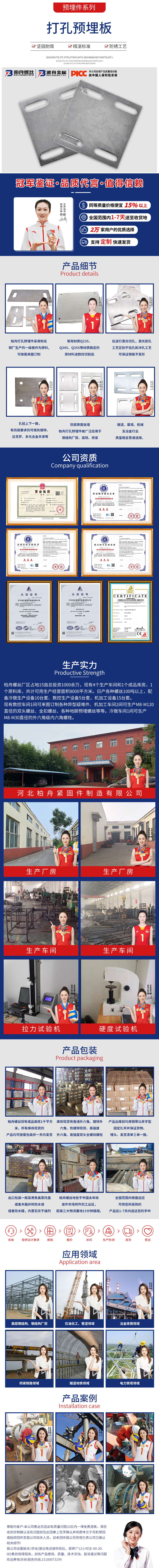 產(chǎn)品介紹:柏舟打孔預(yù)埋件采用知名鋼廠生產(chǎn)的一級板作為原料,可按需來圖訂制。常用材質(zhì)Q235、Q345、Q355等材質(zhì)穩(wěn)定的原材料進數(shù)控切割后在進行激光切孔。激光割孔工藝區(qū)別于鉆孔和沖孔工藝,可保證鋼板不變形,孔徑上下一致。有防腐要求的可做熱鍍鋅、達克羅、多元合金共滲等防腐表面處理。柏舟打孔預(yù)埋件被廣泛應(yīng)用于鋼結(jié)構(gòu)廠房、高鐵、橋梁、隧道、幕墻、機械及冶金行業(yè)
