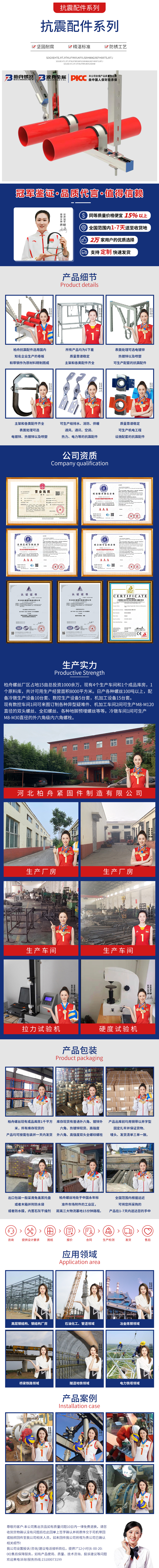 產(chǎn)品介紹:柏舟抗震配件選用國內(nèi)知名企業(yè)生產(chǎn)的卷板和帶鋼作為原材料精制而成,所有產(chǎn)品均為0下差,質(zhì)量靠譜穩(wěn)定。主架和各類配件齊全,表面處理可選電鍍鋅、熱鍍鋅以及噴塑??缮a(chǎn)給排水、消防、供暖、通風、通訊、空調(diào)、熱力、電力等機電工程設(shè)施配套的抗震配件。